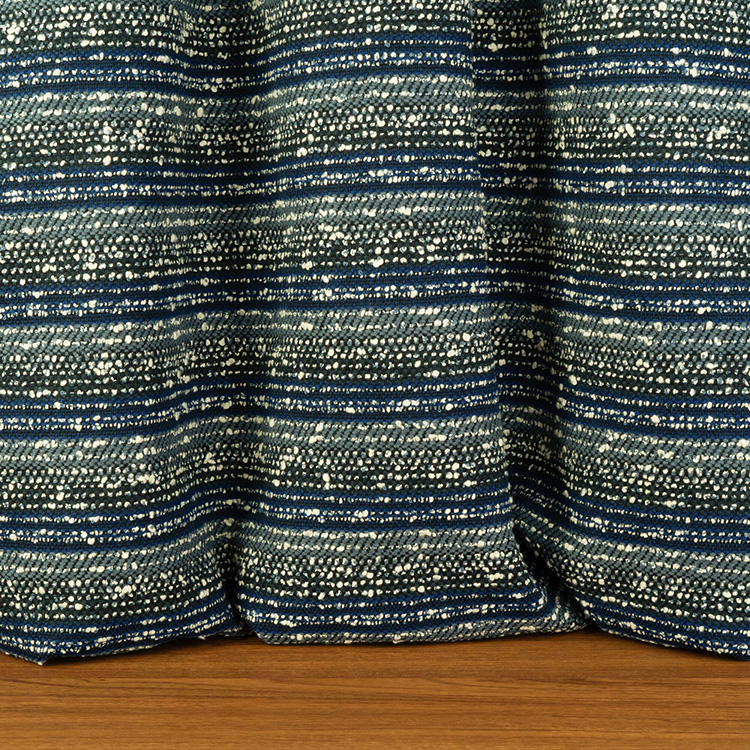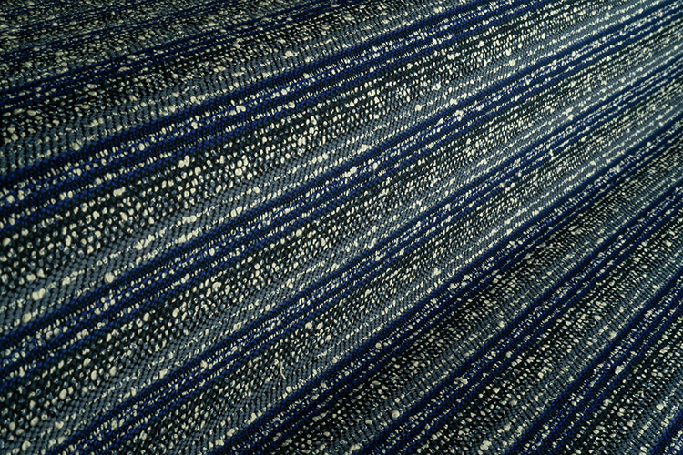 ソフトな手触りでありながら、ざらつきのあるテクスチャーと十分な強度をもった張地です。ボリューム感のある様々な色の糸をストライプ状に組み合わせており、 なかでも 2 色のブークレ糸が 手織りの特徴を出しています。