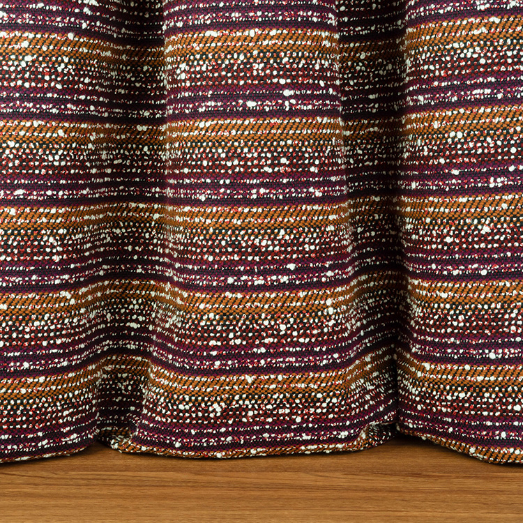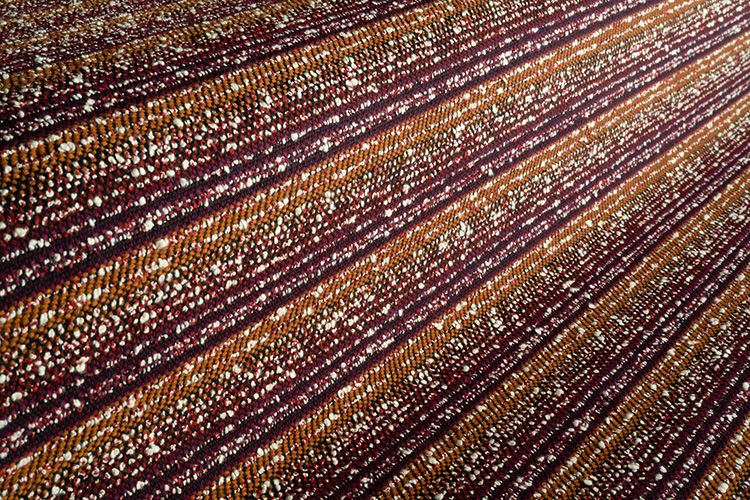 ソフトな手触りでありながら、ざらつきのあるテクスチャーと十分な強度をもった張地です。ボリューム感のある様々な色の糸をストライプ状に組み合わせており、 なかでも 2 色のブークレ糸が 手織りの特徴を出しています。