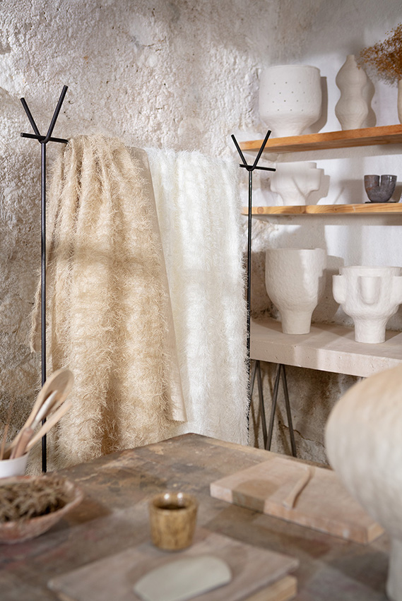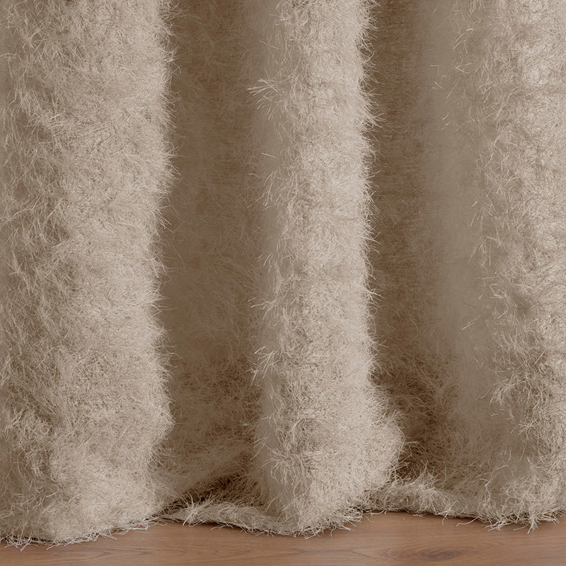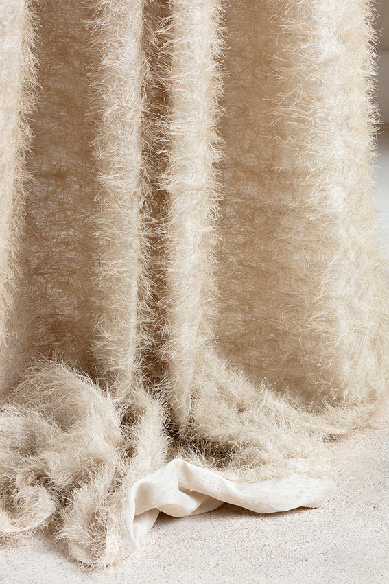 PASTORAL WEAVE は、まるで毛皮のような外観を持つ豪華なカーテン生地です。横糸の非常に長い浮きヘンプ糸は繊細なシルクの縦糸に織り込まれ、クリップコード技法でカットされています。特殊な仕上げが、糸に方向性とボリュームを与えています。