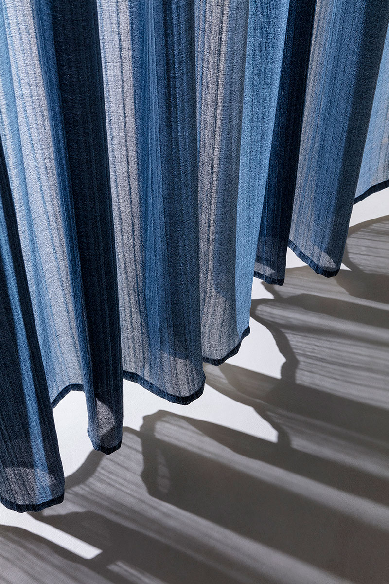 - 使用済みの難燃糸をリサイクルした糸を100%使用した先染めのジャカード生地。織り方によって細いストライプと色のグラデーションが生まれ、繊細な構造と柔らかい感触を生み出します。