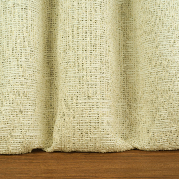 バスケット織を思わせるざっくりとした生地感のカーテン生地。お手入れしやすいポリエステルとアクリルの混紡で、ナチュラルな表情と柔らかな風合いが特徴です。 2色の糸を使ったテクスチャーのある生地で、フラットなラフィアのような糸とブークレ糸を組み合わせて抽象的なパターンを作り出しています。