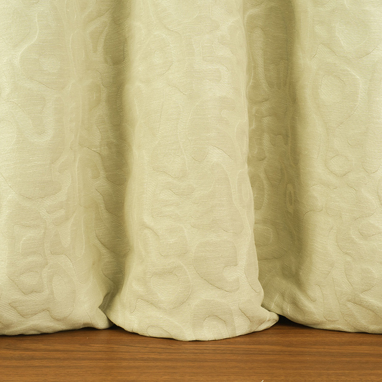 はっきりとした凹凸のある中厚手のカーテン生地。 この生地のデザインは有機的そして抽象的であり、ジャカード織りされたリネンとポリエステルの異なる特性によって実現されています。