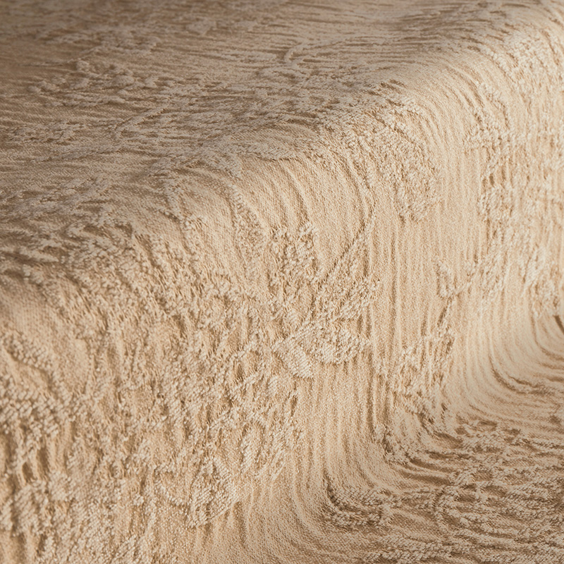 コットン、レーヨン、リネンの混紡ファブリック。花のモチーフは染色工程を経て変化し、滑らかな部分とテクスチャーのある部分が織りなす繊細なコントラストを生み出します。シェニール織りとドラム染色技法により、1メートルごとにわずかな違いがあり、すべてのカットが唯一無二の一枚となっています。