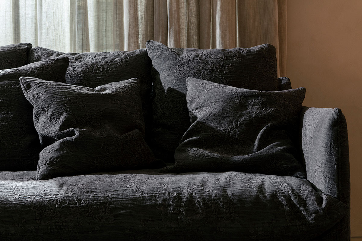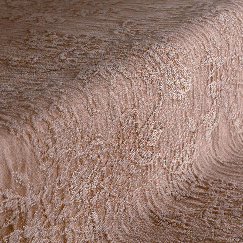 コットン、レーヨン、リネンの混紡ファブリック。花のモチーフは染色工程を経て変化し、滑らかな部分とテクスチャーのある部分が織りなす繊細なコントラストを生み出します。シェニール織りとドラム染色技法により、1メートルごとにわずかな違いがあり、すべてのカットが唯一無二の一枚となっています。