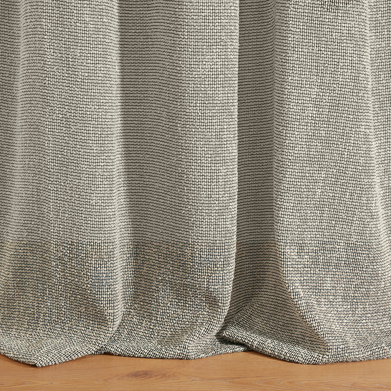 - ブークレー糸を使用することで表面に粗い凹凸を出した先染め絡み織りの広幅生地。ソフトでボリューム感のある生地は半透明で、流れるようなドレープが特徴です。工場廃棄物からリサイクルされたポリエステルを100%使用し、難燃性に優れています。同じ色調で異なる色の糸を使用することで生き生きとした深みのある色合いを実現しています。